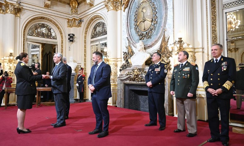 El jueves pasado, el Presidente había hecho lo propio con la entrega de sables y despachos a los nuevos generales, almirantes y brigadieres del Ejército Argentino, la Armada Argentina y la Fuerza Aérea Argentina, en un acto realizado en el mismo lugar y en el cual había estado acompañado por jefe de Gabinete, Agustín Rossi, y el ministro de Defensa, Jorge Taiana.