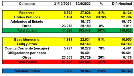En el año 2001 el balance del Banco Central no estaba contaminado con la gran emisión monetaria que tenemos en la actualidad. Si bien la base monetaria aumento un 91% en dólares, cuando miramos el rubro leliq y otros no existía en el año 2001 y hoy muestra un pasivo de U$S 64.163 millones.