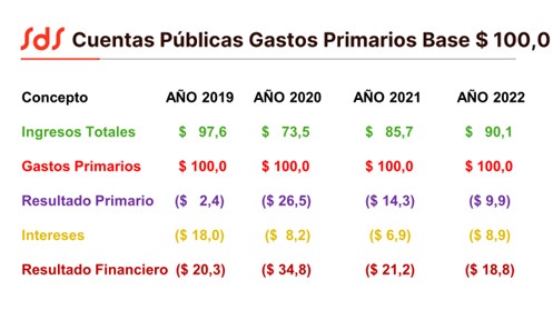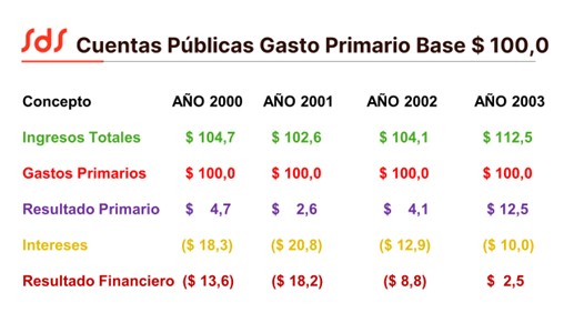 Medimos las cuentas públicas entre los años 2000 y 2003 en donde tomamos el gasto primario base $ 100. Allí podrán observar que entre los años 2000 y 2003 argentina tenían resultado primario positivo, y que en el año 2003 después de declarar el no pago de la deuda paso a tener superávit financiero.
