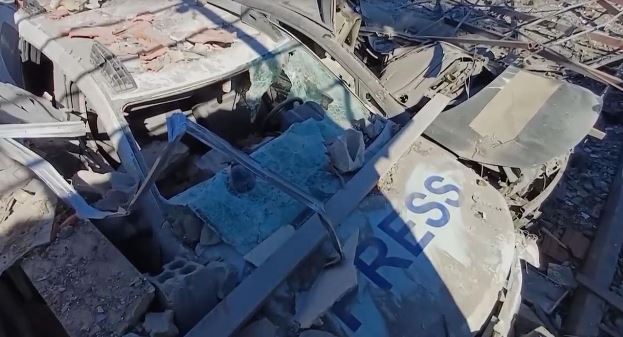 Afuera de los edificios ahora derrumbados que fueron alquilados por varios medios de comunicación, autos marcados “PRENSA” yacían cubiertos de polvo y escombros después del ataque, mostraron fotos de Associated Press.
