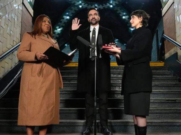 Mamdani, un demócrata, prestó juramento como el primer líder musulmán de la ciudad más grande de Estados Unidos, colocando su mano sobre un Corán mientras hacía su juramento.