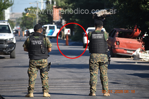 Personal de Gendarmería Nacional trabaja en el lugar realizando pericias por orden fiscal, en el interior del barrio y sobre la Avenida Eva Perón, entre Maipú -Diagonal 122- y la calle 126, donde cayó abatido un delincuente aún no identificado.