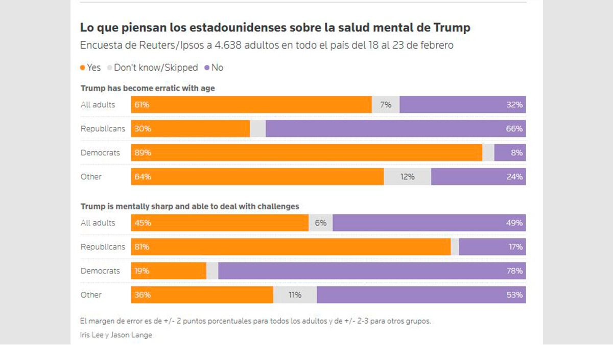 Solo el 45% de los encuestados considera que Trump mantiene agudeza mental, frente al 54% en septiembre de 2023. Entre republicanos, el 81% sigue percibiéndolo capaz; entre demócratas, solo el 19%; y entre independientes, 36%.